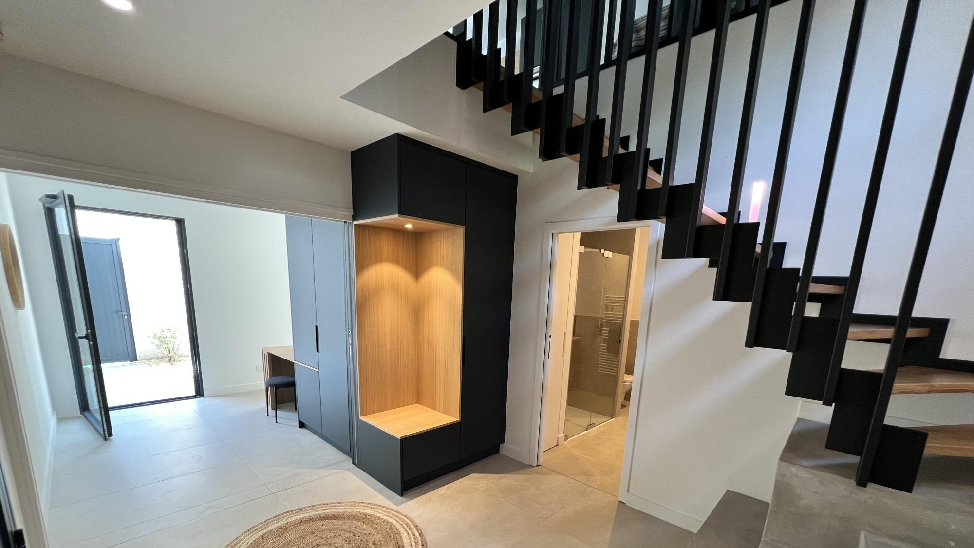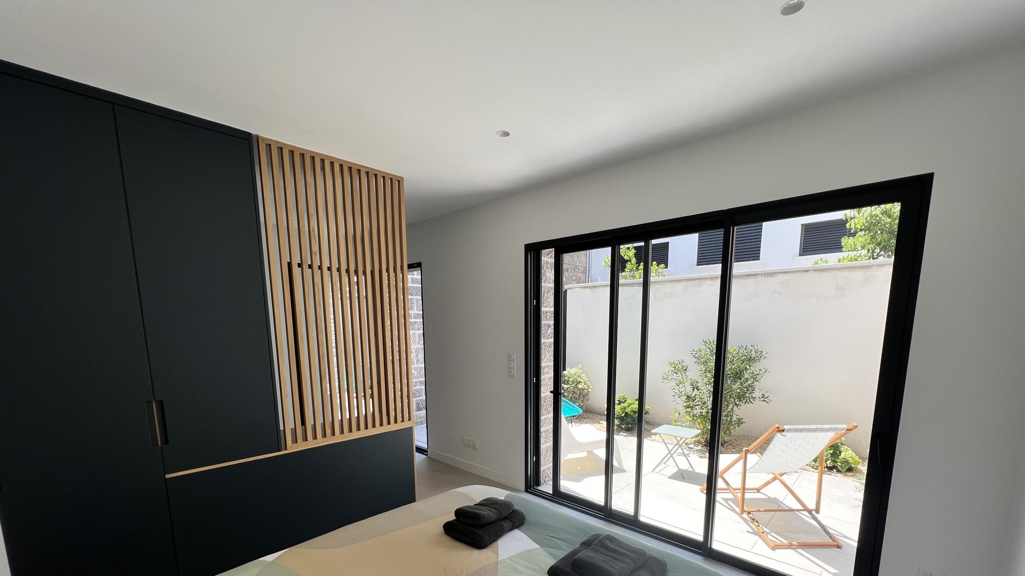 Au rez-de-chaussée : Entrée, Suite Parentale donnant sur une belle terrasse végétalisée, avec dressing, bureau, et salle de bain, WC, buanderie (avec lave-linge, sèche-linge). Garage (10mètresx3mètres).