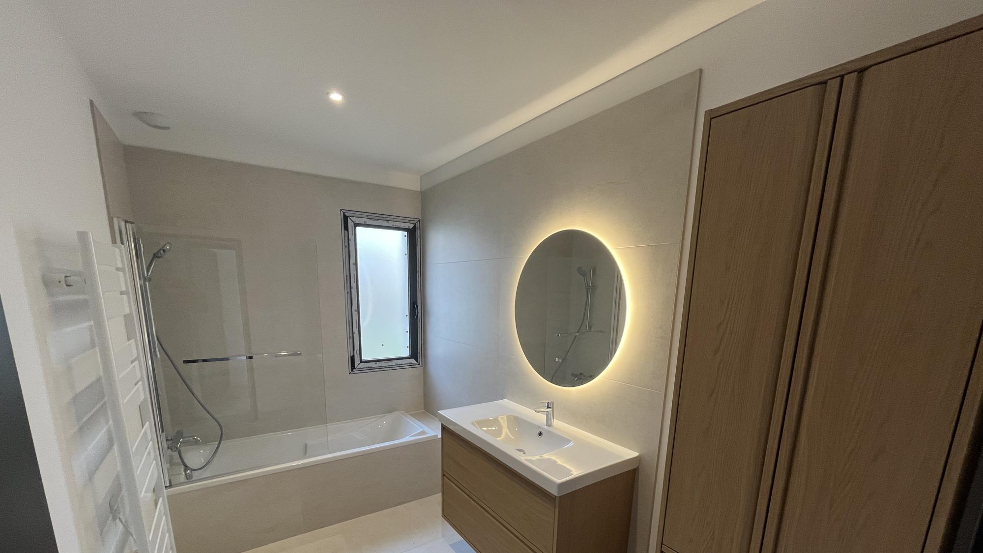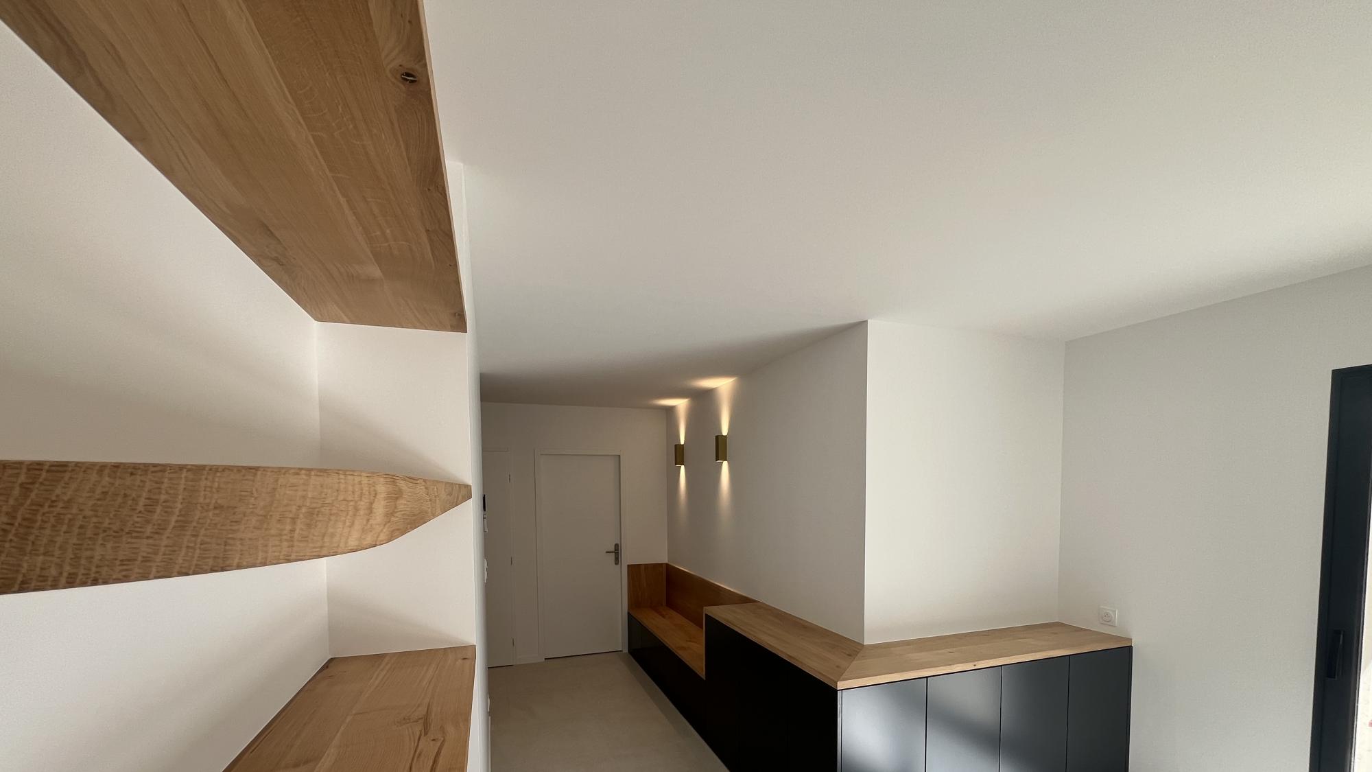 Elle est composée d’une entrée avec son dressing et son meuble d’assise sur mesure, d’un séjour avec une cuisine équipée d’un mobilier sur mesure, d’un cellier-buanderie attenant, de 4 chambres (ou 3 chambres et 1 bureau), dont 1 suite parentale avec dressing et salle d’eau privative, d’une salle de bain, et de 2WC.